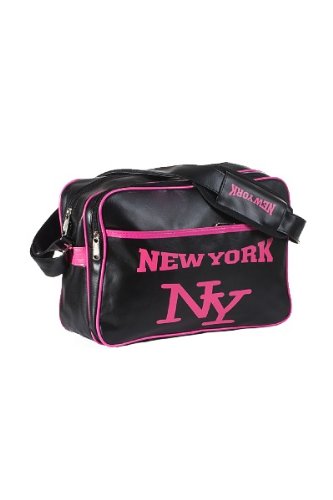 Grand sac de ville sérigraphié"New York" sur l'avant Passepoil contrastant Sangle réglable par boucle avec protection pour les épaules Deux compartiments avec fermetures zippées 1 poches extérieure devant fermée par zip Rappel de sérigraphie sur la sangle Fermeture zippée à l'intérieur Dimensions env.: 36 x 25 x 13 cm.